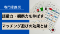 「おうち遊びでわが子の言葉を増やしたい」「集中力を伸ばしたい」そんなパパ・ママに、試してほしいのが「マッチング遊び」です。 マッチング遊びは、言語聴覚療法の訓練にも使われるほど、語彙力・理解力・思考力をバランスよく育てられる発達支援...