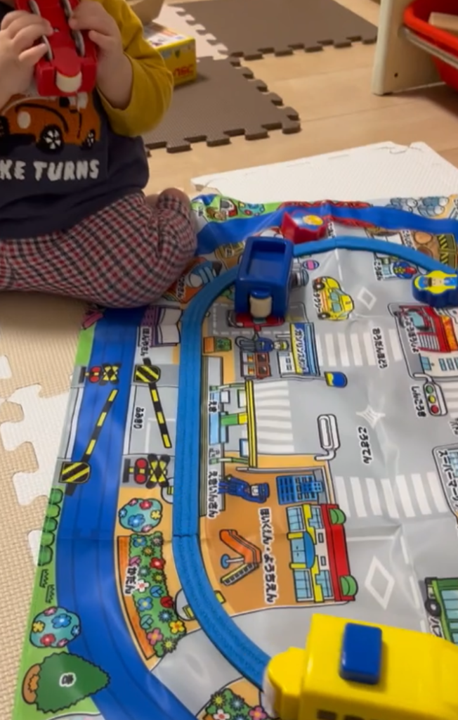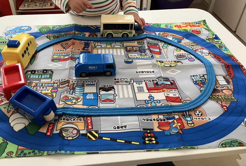 「バスが消防署前に向かいます。電車が来るので止まります!」「ごみ収集車がまちのごみを集めまーす!」と声をかけると、夢中になって遊んでいます。